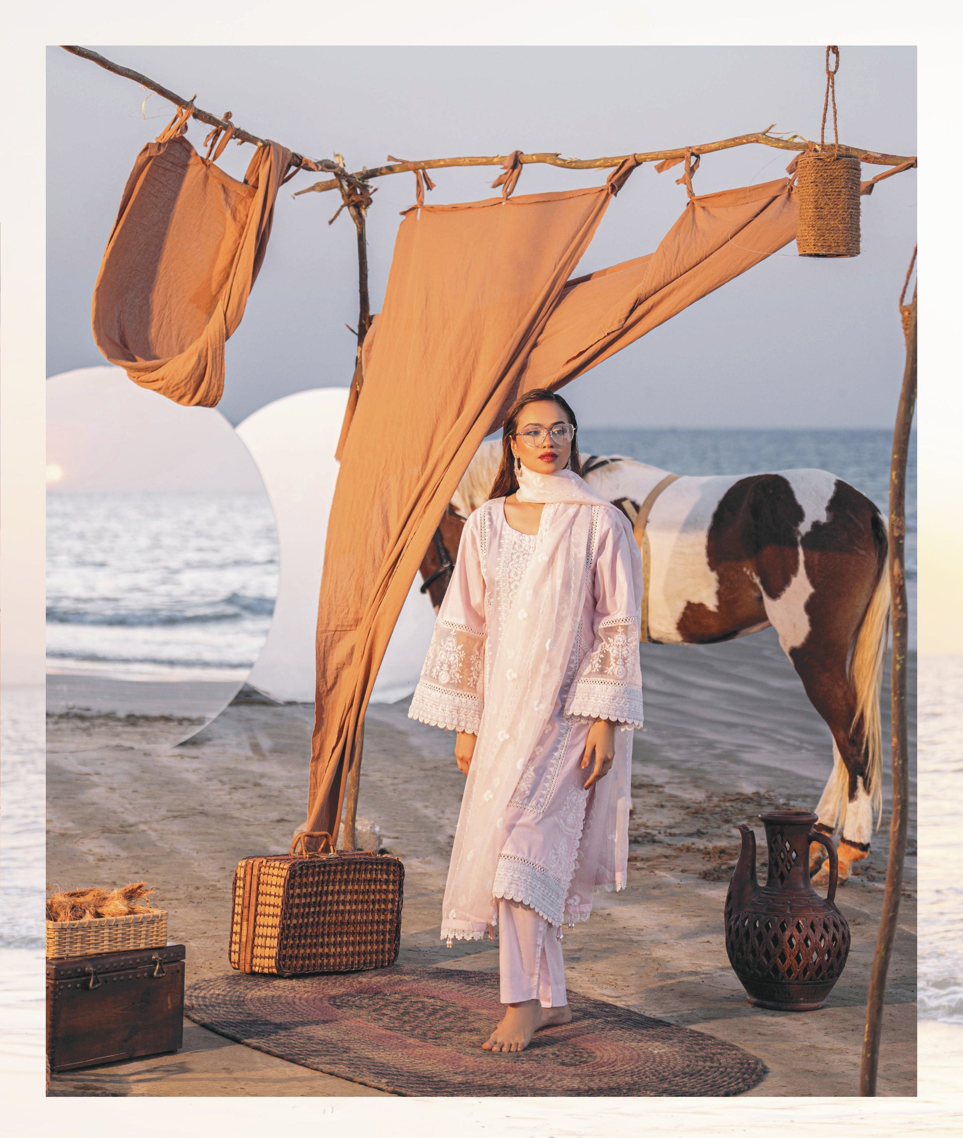 Shirt: Fully stitched embroidered cotton shirt, adorned with delicate lacework, intricate handwork, and latkan embellishments for a refined finish.